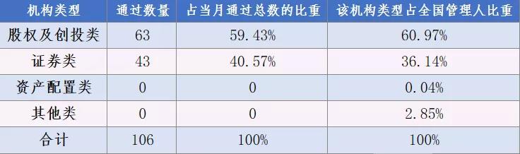 上圖為2021年10月通過的各類型私募基金管理人數(shù)量及占比詳情。對比2021年9月份(通過股權及創(chuàng)投類108家,證券類86家),新登記通過的股權和創(chuàng)投類私募基金管理人和證券類私募基金管理人有所下降。