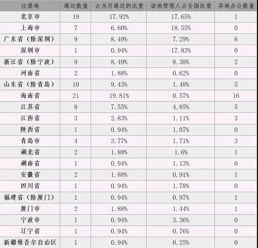 上圖為2021年10月登記的私募基金管理人地域分布與異地辦公情況分析圖。在新登記的106家私募基金管理人中,私募基金管理人注冊地前三大地區(qū)分別為海南省、北京市、山東省。其中海南省通過數(shù)量多達21家。