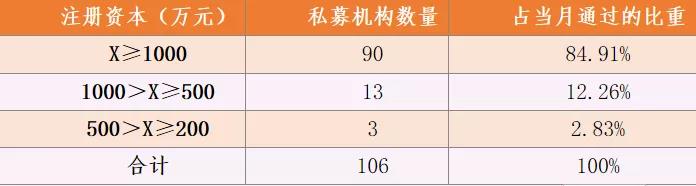 上圖為2021年10月登記的私募基金管理人注冊資本分布圖,注冊資本大于1000萬的私募基金管理人有90家,占當月通過比重約為84.91%,可見注冊資本超過1000萬元的私募基金管理人更容易通過登記。