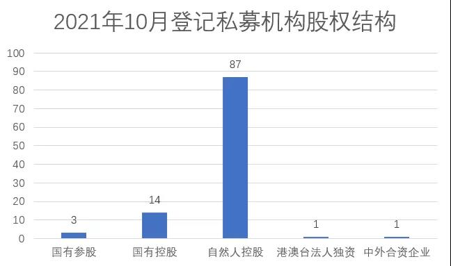 上圖為2021年10月登記私募基金管理人股權結(jié)構圖。在2021年10月登記的106家私募基金管理人中,有87家私募基金管理人完全由自然人股東出資,占比約82.07%。有14家為國有控股,有3家為國有參股,有1家港澳臺法人獨資,1家中外合資企業(yè)。